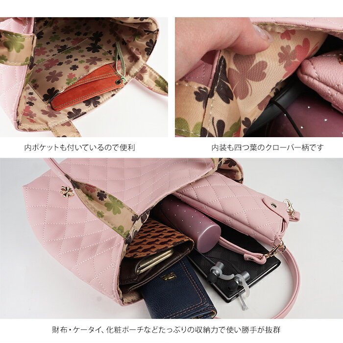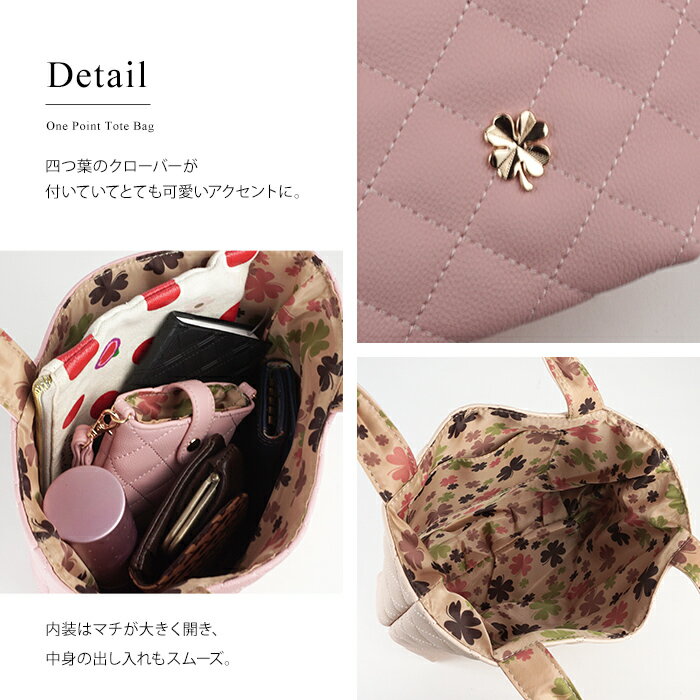 外側には高級感のあるキルティング加工、内側には可愛いクローバー生地を使用した愛らしいオーラが溢れるレディースアイテム。